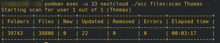 podman exec -u 33 nextcloud ./occ files:scan Thomas